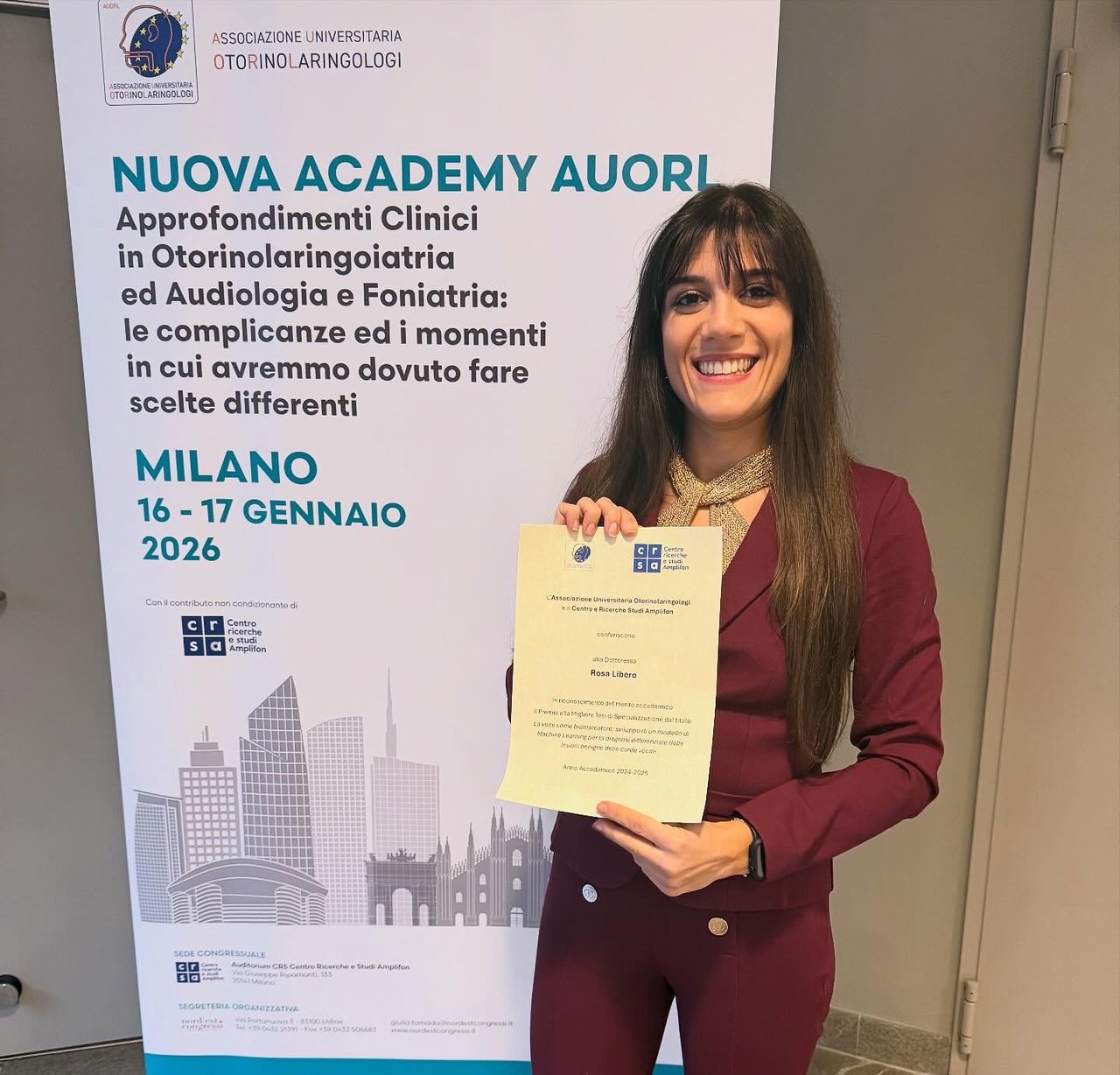- 2026 - Riconoscimento del merito accademico e Premio alla Migliore Tesi di Specializzazione per l’anno accademico 2024/2025 conferito dall’Associazione Universitaria Otorinolaringologi (AUORL) e dal Centro Ricerche e Studi Amplifon (CRSA).